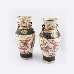 a balaustro in porcellana craquelé decorati con scene di cavalieri e altorilievi di ispirazione floreale. Firmati [..]