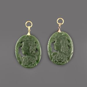 in nefrite finemente incisi e traforati a raffigurare un profilo femminile, montatura in oro giallo, gr. 22,1. [..]