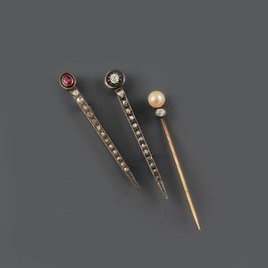 di tre spilloni in argento e oro con rubino, perle e diamanti, gr. 11,1.
