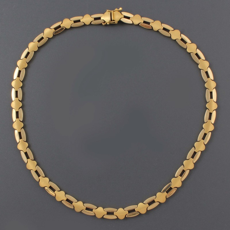 in oro giallo con elementi snodati a motivi geometrici, gr. 36,9. Lunghezza 45,5 cm