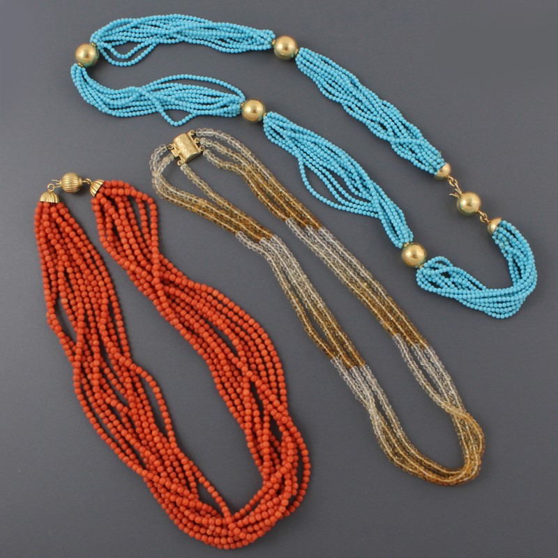 composto da tre collane, una in corallo, una in quarzo e una con pasta di turchesi, chiusure in oro giallo, gr. 135,6. Lunghezze varie