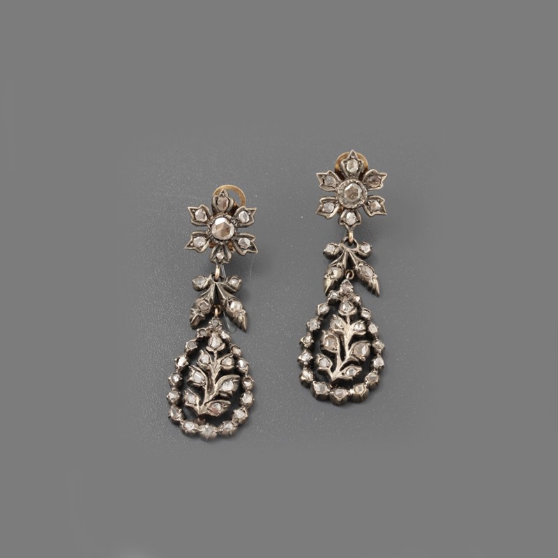 in oro e argento a motivi fogliacei con diamanti a rosa, gr. 17,4.