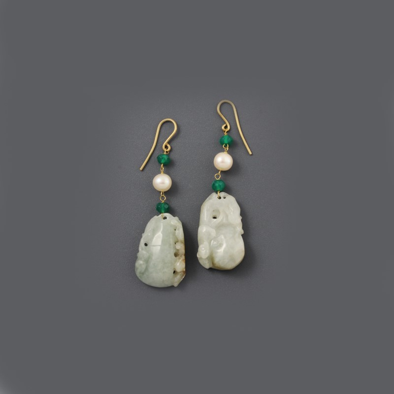 con giadeite incisa, crisoprasio e perle coltivate montati in oro giallo, gr. 16,9. Corredati da custodia.