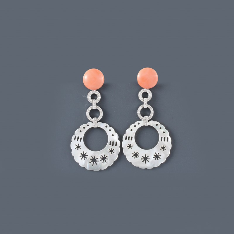 pendenti in oro bianco con corallo cabochon a sostegno di due cerchi in brillanti e tondo in madreperla traforata, gr. 11,7.