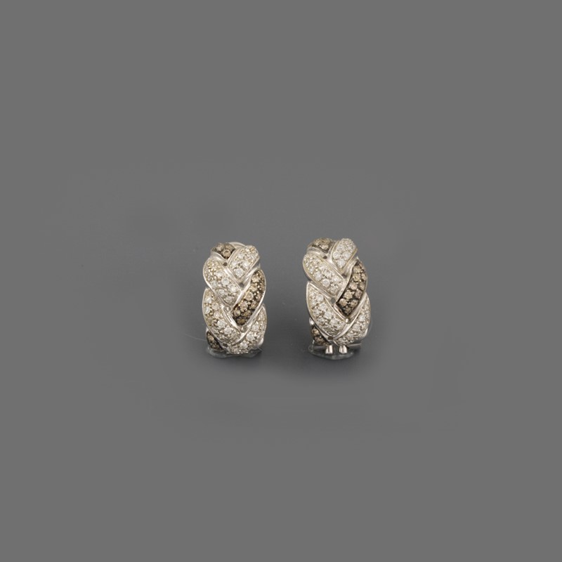 in oro bianco, motivo a intreccio bombato con brillanti incolore e “brown”, gr. 10,2.