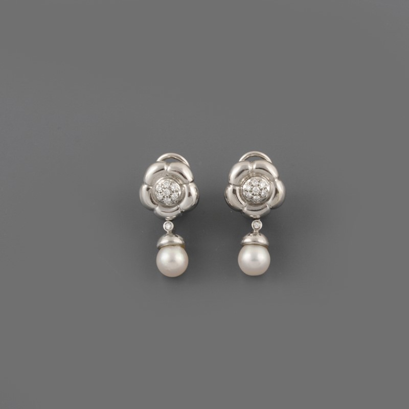 in oro bianco a forma di fiore con piccoli brillanti e perle coltivate pendenti terminali 7,7 mm, gr. 13,7.