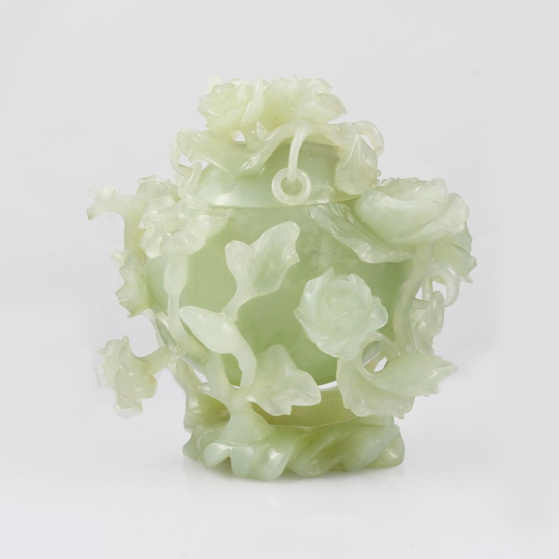 in celadon finemente intagliata a tutto tondo con tralci fogliati, rose e campanule, coperchio anch’esso intagliato con roselline e anelli ad ornamento, altezza 15 cm.