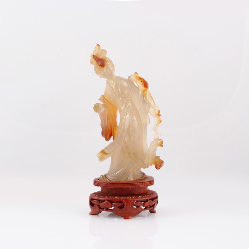 in corniola bicolore incisa, “Guanyin” danzatrice su piedistallo in legno scolpito, altezza totale 16 cm.
