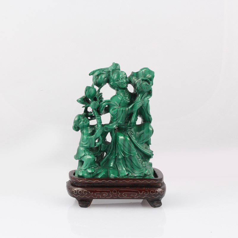 in malachite incisa, due figure cinesi con fiori di loto, su piedistallo in legno, altezza totale 14,5 cm.