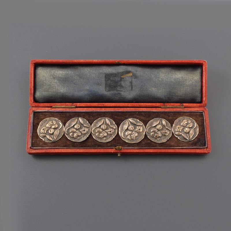 in argento tondi a motivi floreali e cesellati, gr. 15,6. Corredati da custodia. Manifattura inglese