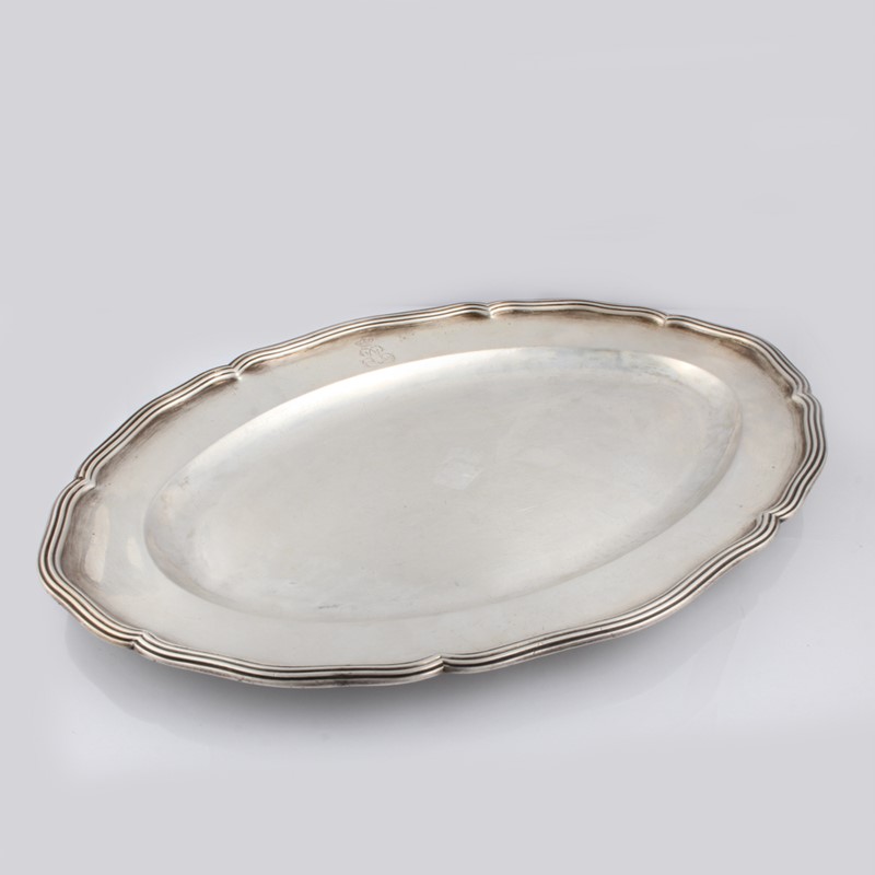 in argento 925 a corpo ovale liscio con monogramma nobiliare inciso sulla falda polilobata con bordatura a più scanalature, gr. 1.224 ca., dimensioni 44 x 31 cm. Manifattura francese, XIX sec. Punzonato ODIOT. APARIS – 3707