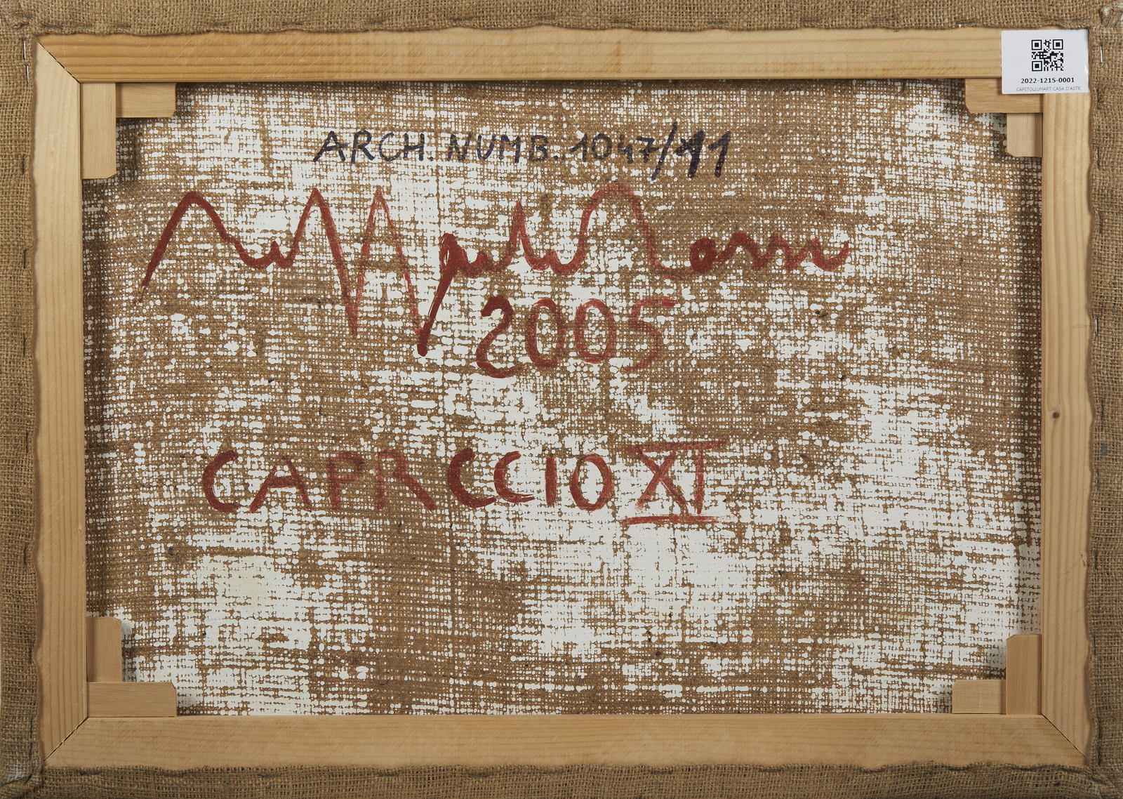 Firma e anno in basso al centro. Al retro titolo, firma e anno. Autentica dell'artista su fotografia, riportante il relativo numero d'inventario.