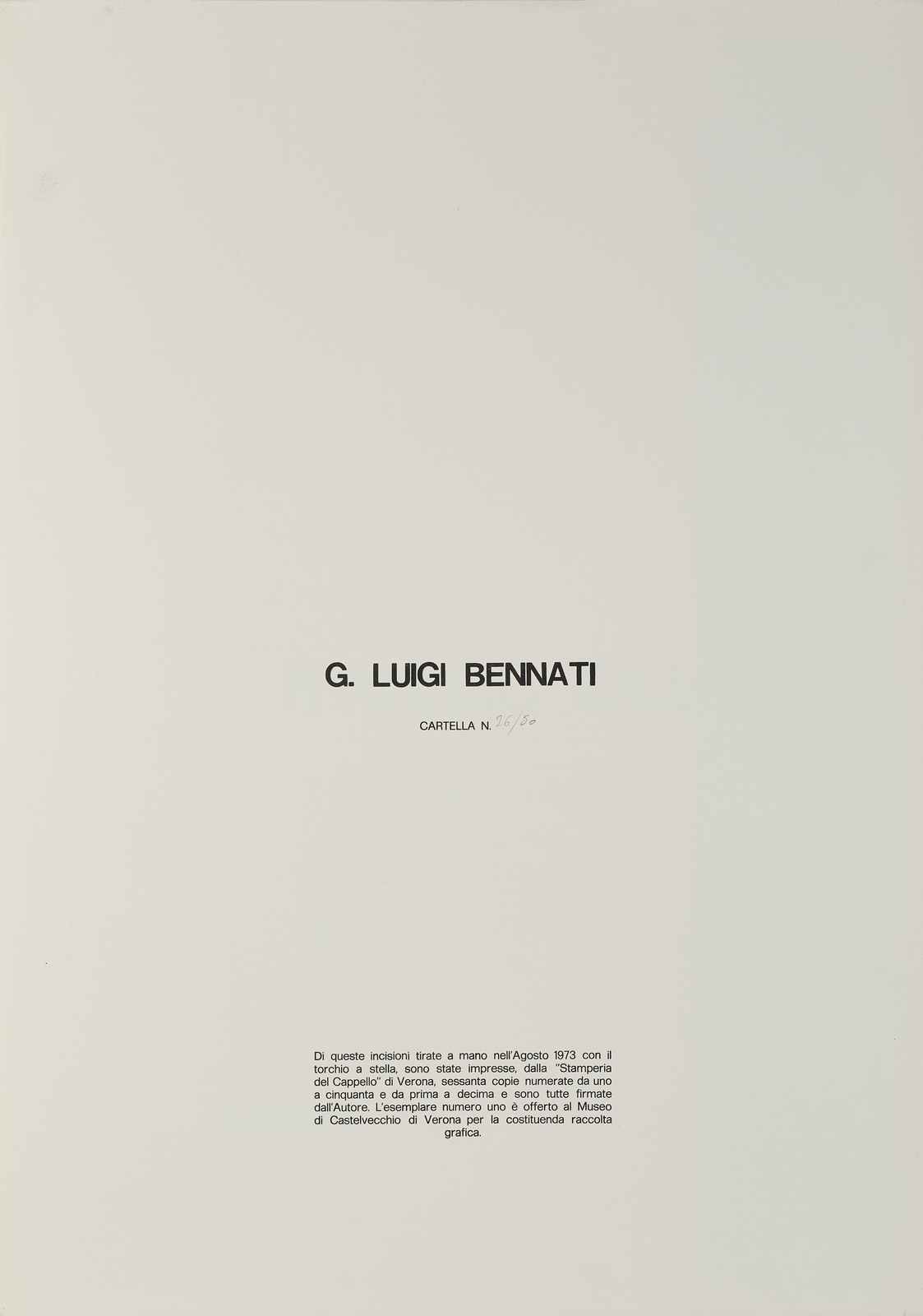 26/50. Tiratura e firma in basso a matita. Timbro a secco Comune di Verona Musei d'arte. Dimensioni lastre: 42,5x27,5 cm, 45x27,5 cm, 42x28 cm. Edizione totale: 60 esemplari numerati da 1 a 50 e 10 esemplari numerati I a X.