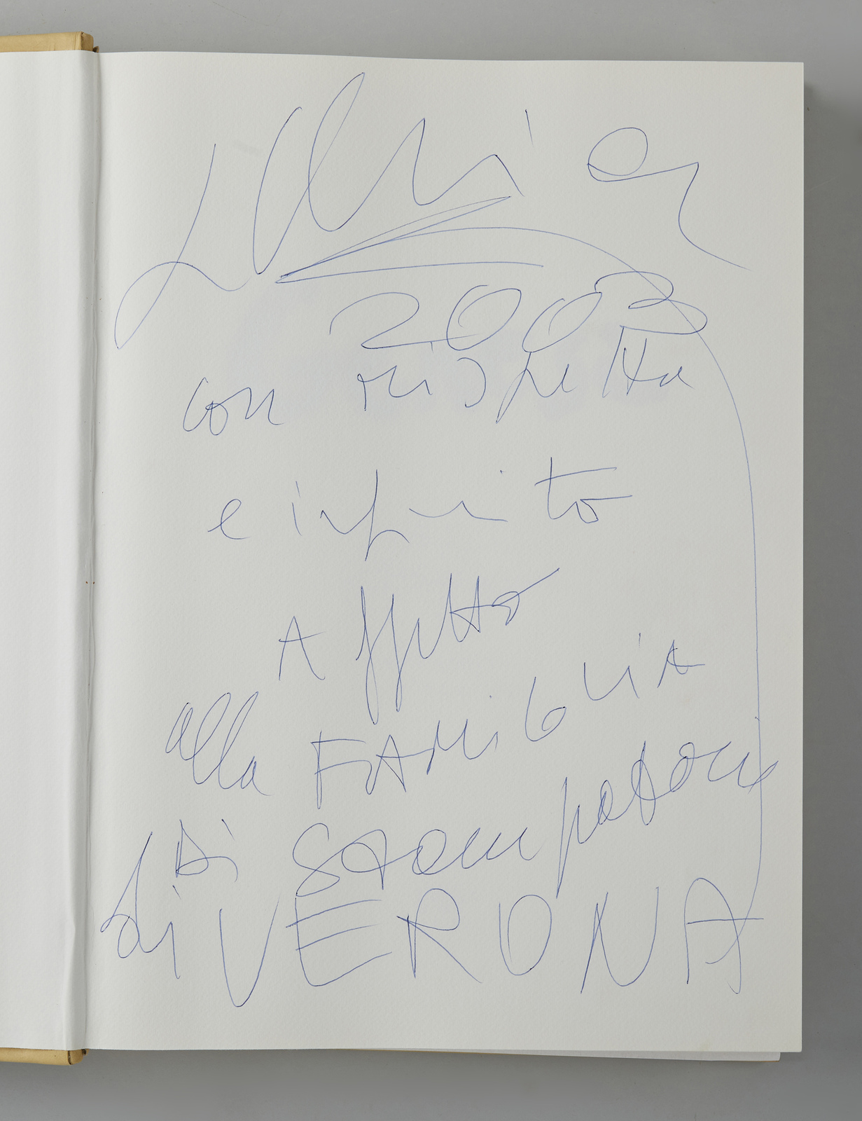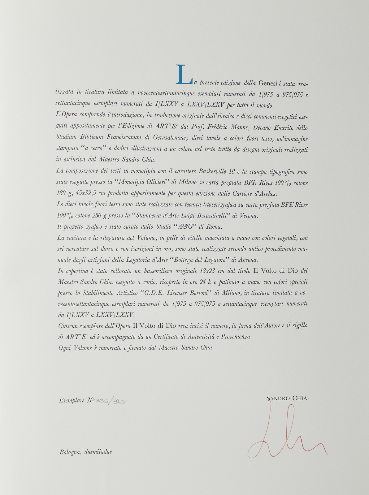 335/975. Tiratura e firma in basso sulla copertina. In prima pagina: dedica, firma e anno. Tiratura e firma nel colophon. Libro d'artista composto da 10 tavole serigrafate. In copertina: Il volto di Dio, Sandro Chia, bassorilievo ricoperto d'oro 24k, Stabilimento Artistico GDE Licensee Bertoni, Milano. Edizione totale: 975+LXXV esemplari. Confezione originale. Editore: FMR-Art'é, Bologna, 2002.