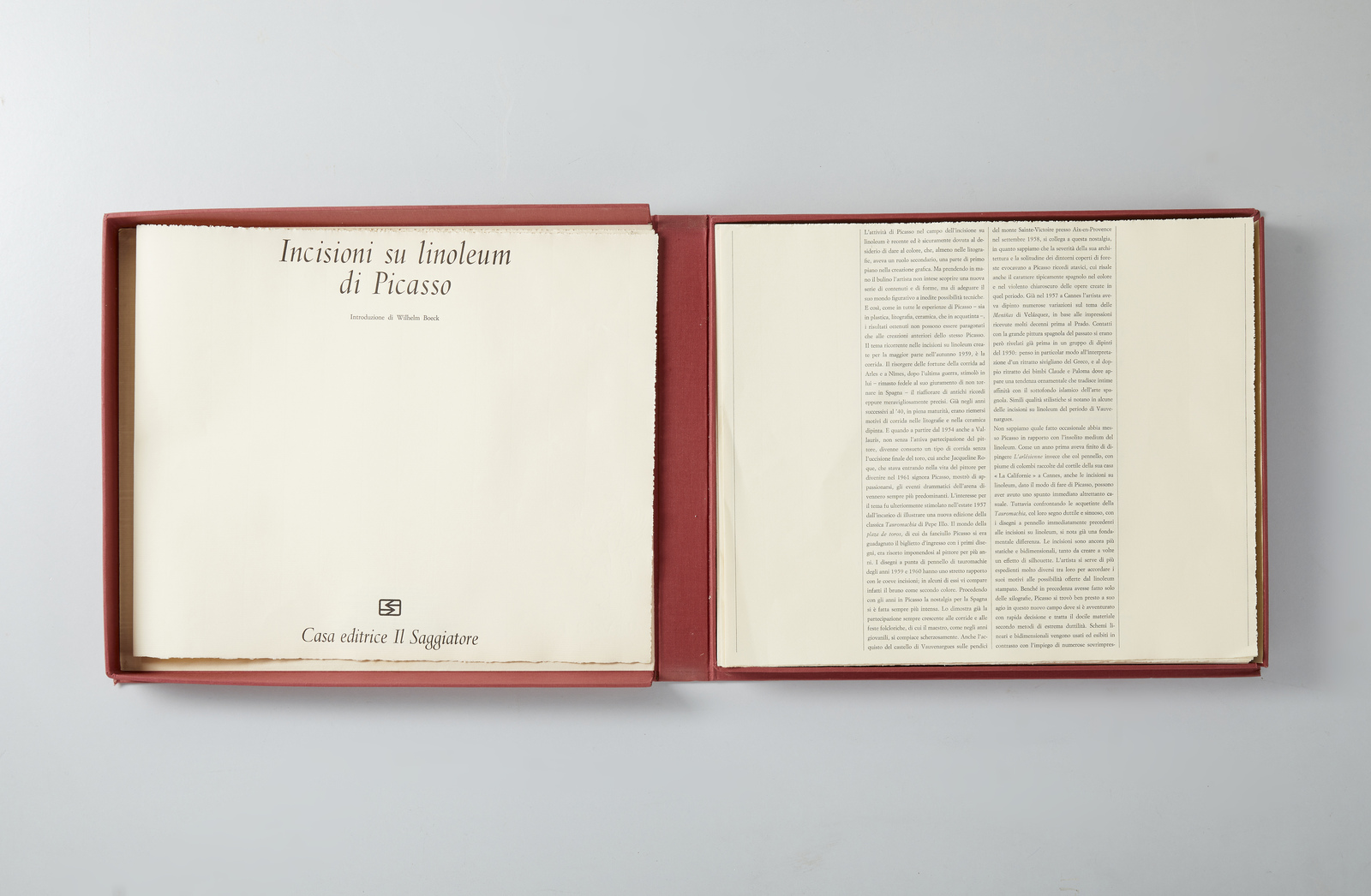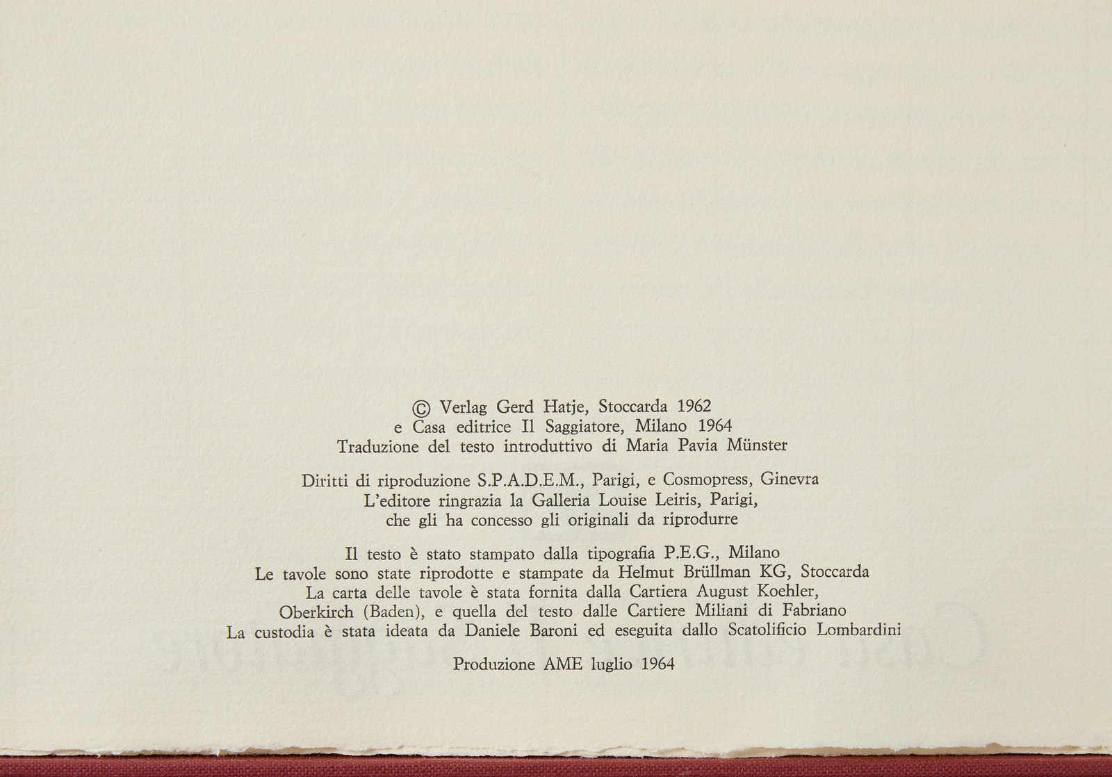 Cartella completa composta da n. 45 incisioni su Linoleum a colori. Dimensioni lastra: 31x38,3 cm. Casa editrice: Verlag Gerd Hatje, Stoccarda, 1962. Il Saggiatore, Milano 1964. Stampatore: P.E.G., Milano. Helmut Brüllman KG, Stoccarda. Carta: Cartiera August Koehler, Oberkirch. Cartiere Miliani, Fabriano. Produzione AME, luglio 1964. Lievi difetti.