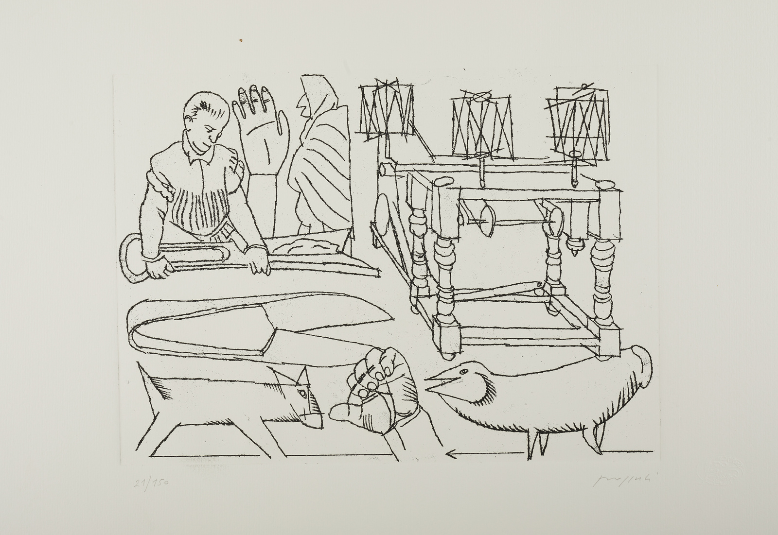 21/150. Tiratura e firma in basso a matita. Dimensione lastra: 25x34.5 cm. Timbro a secco Il Tritone in basso a destra.
