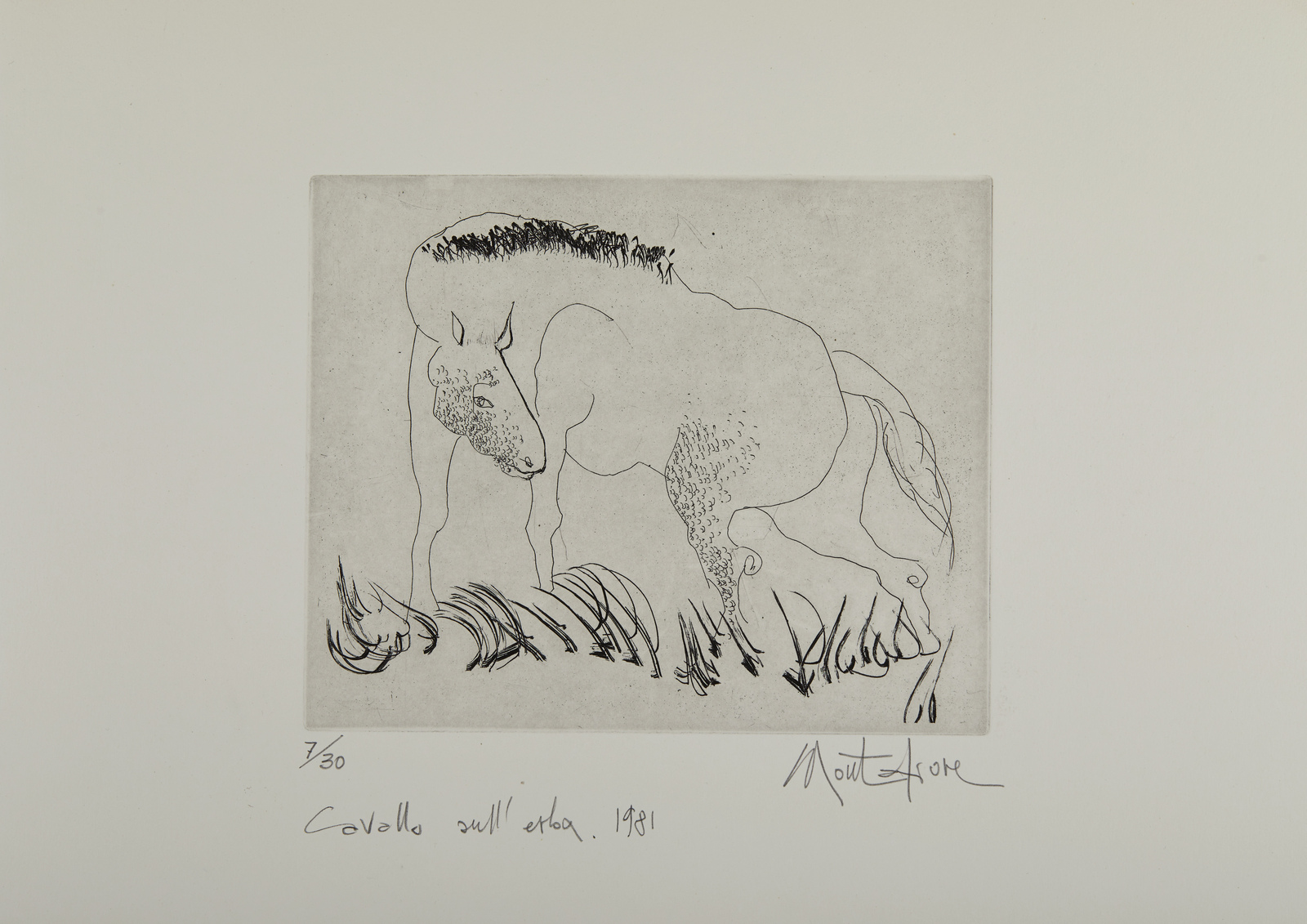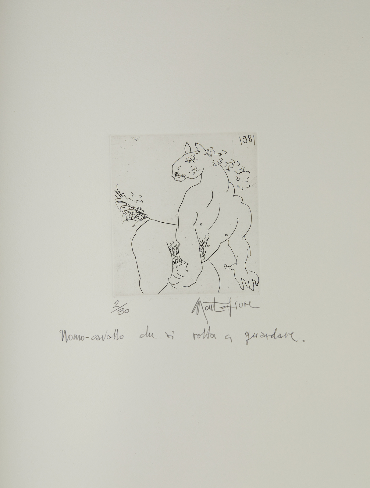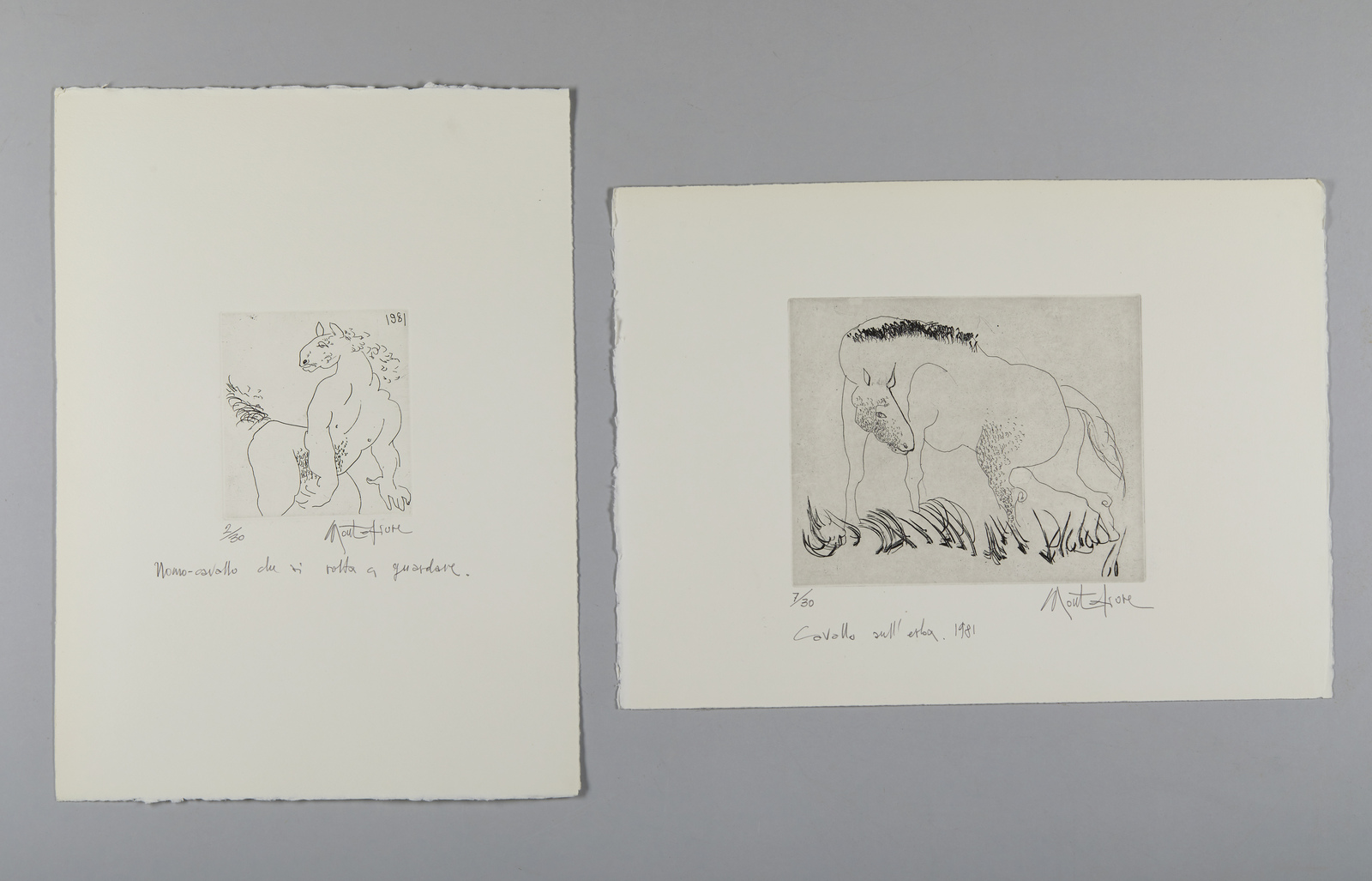 - 2/30. Uomo-cavallo che si volta a guardare. Tiratura, firma e titolo in basso a matita. Anno in alto a destra a stampa. Edizione totale: 30 esemplari. Dimensione lastra: 14.5x13 cm.- 7/30. Cavallo sull'erba. Tiratura, firma, titolo e anno in basso a matita. Edizione totale: 30 esemplari. Dimensione lastra: 20x24.5 cm.