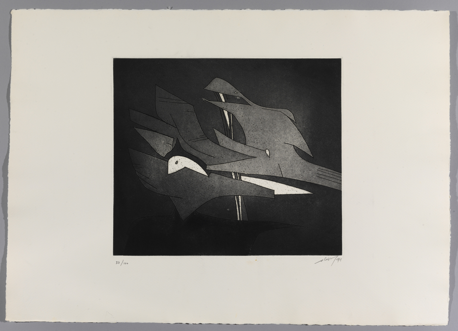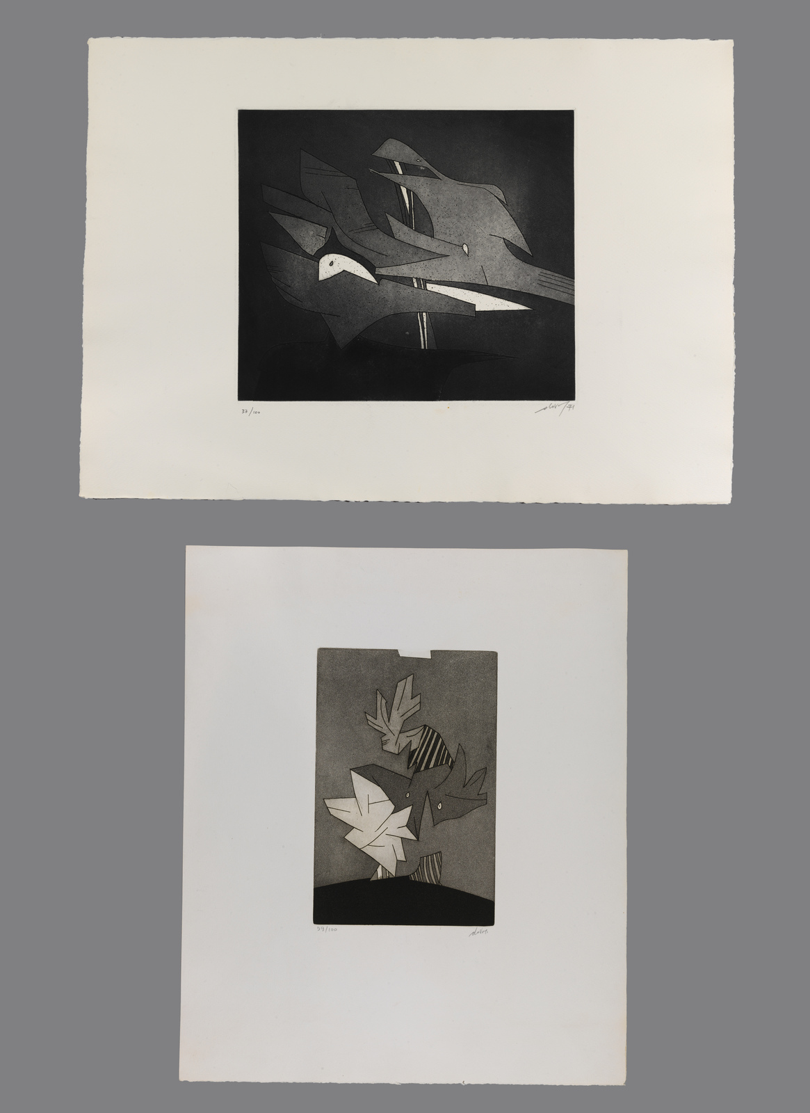 1. 99/100. Tiratura e firma in basso a matita. Dimensione: 57,5x48, dimensione lastra: 29,5x20 cm.2. 37/100. Tiratura e firma in basso a matita. Dimensione: 50x70, dimensione lastra: 31,5x36 cm