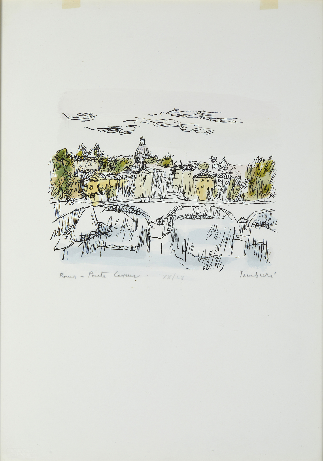 1. Ponte Cavour-Roma. XX/LX. Tiratura, titolo e firma in basso a matita. Timbro a secco Stampatore Luigi De Tullio in basso a sinistra. Xilografia acquerellata a mano. 50x36 cm. Certificato di provenienza rilasciato da Albatros di F. Giusti, Milano.2. Senza titolo. P.d.a. Tiratura e firma in basso a matita. Timbro a secco Graphis Arte, Livorno. Litografia colorata a mano. 67x47 cm.