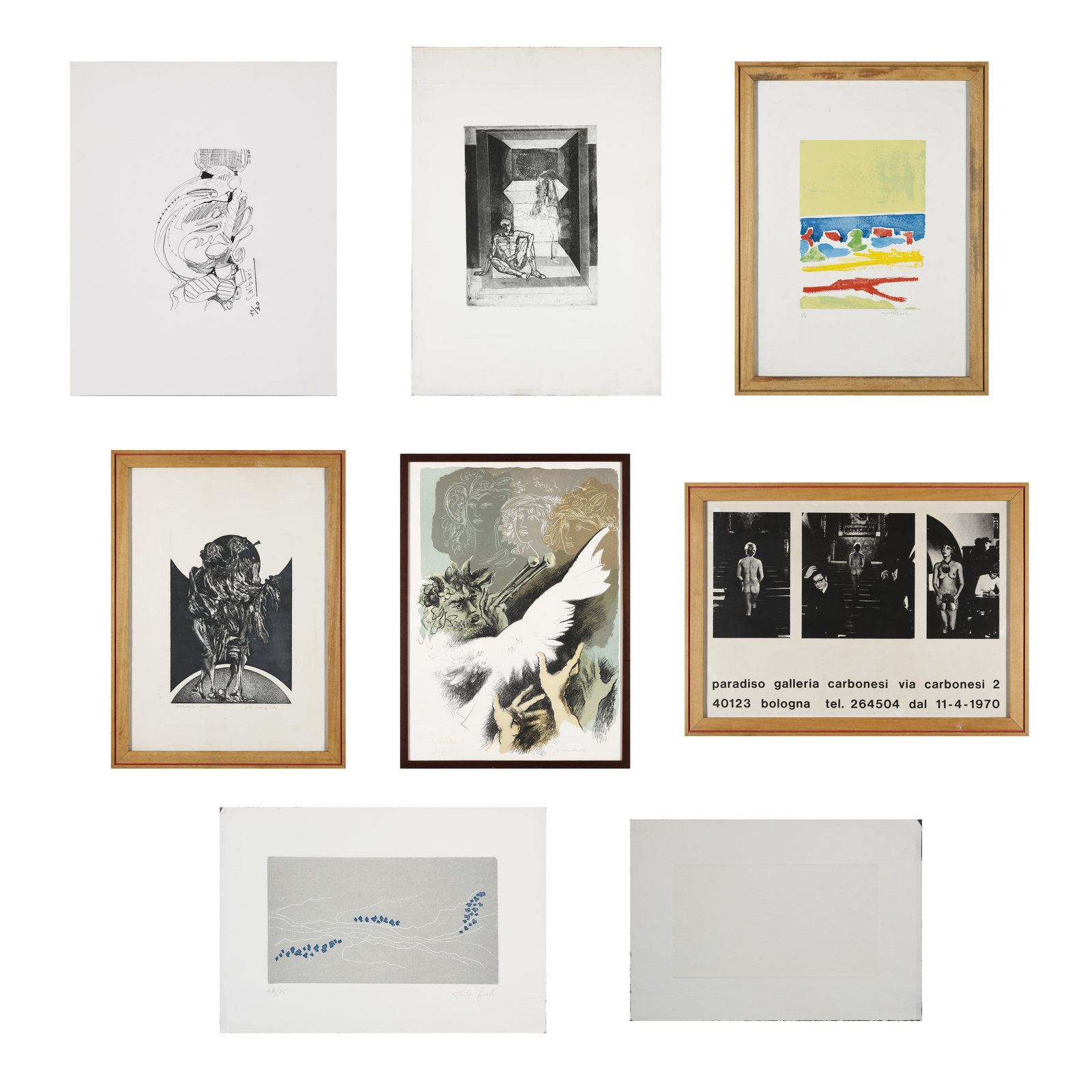 1. Senza titolo, litografia, 30x25.5 cm. 11/30. Tiratura a matita in basso a sinistra, firma in lastra in basso a sinistra.2. Senza titolo, acquaforte e acquatinta, 25x17.5 cm. 48/75. Tiratura e firma in basso a matita. Dimensione lastra: 10x17.5 cm3.Senza titolo, litografia, 50x70 cm, 1982. LXXIV/C. Tiratura, titolo, firma e anno in basso a matita.4. Senza titolo, acquaforte, 49x69 cm, 1971. 6/20. Titolo, firma, tiratura e anno in basso a matita. Dimensione lastra: 41x29.5 cm.5. Senza titolo, litografia, 49x65 cm. I/X. Tiratura e firma in basso a matita. 6. Senza titolo, fotolitografia, 69x49 cm.7. Senza titolo, acquaforte, 50x70 cm. 18/50. Tiratura e firma in basso a matita. Dimensione lastra: 36.5x26.5 cm. Difetti.