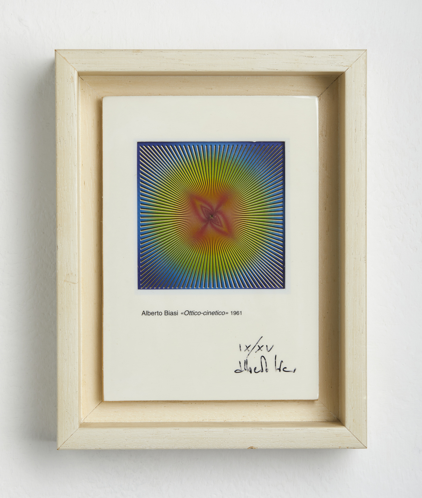 IX/XV. Tiratura e firma in basso a destra a pennarello. Cartolina cartonata, raffigurante un'opera dell'Artista del 1961, edita in occasione dell'esposizione Luce movimento & programmazione - Kinetische Kunst aus Italien 1958-1968 . Stampatore: Zanardi, Padova
