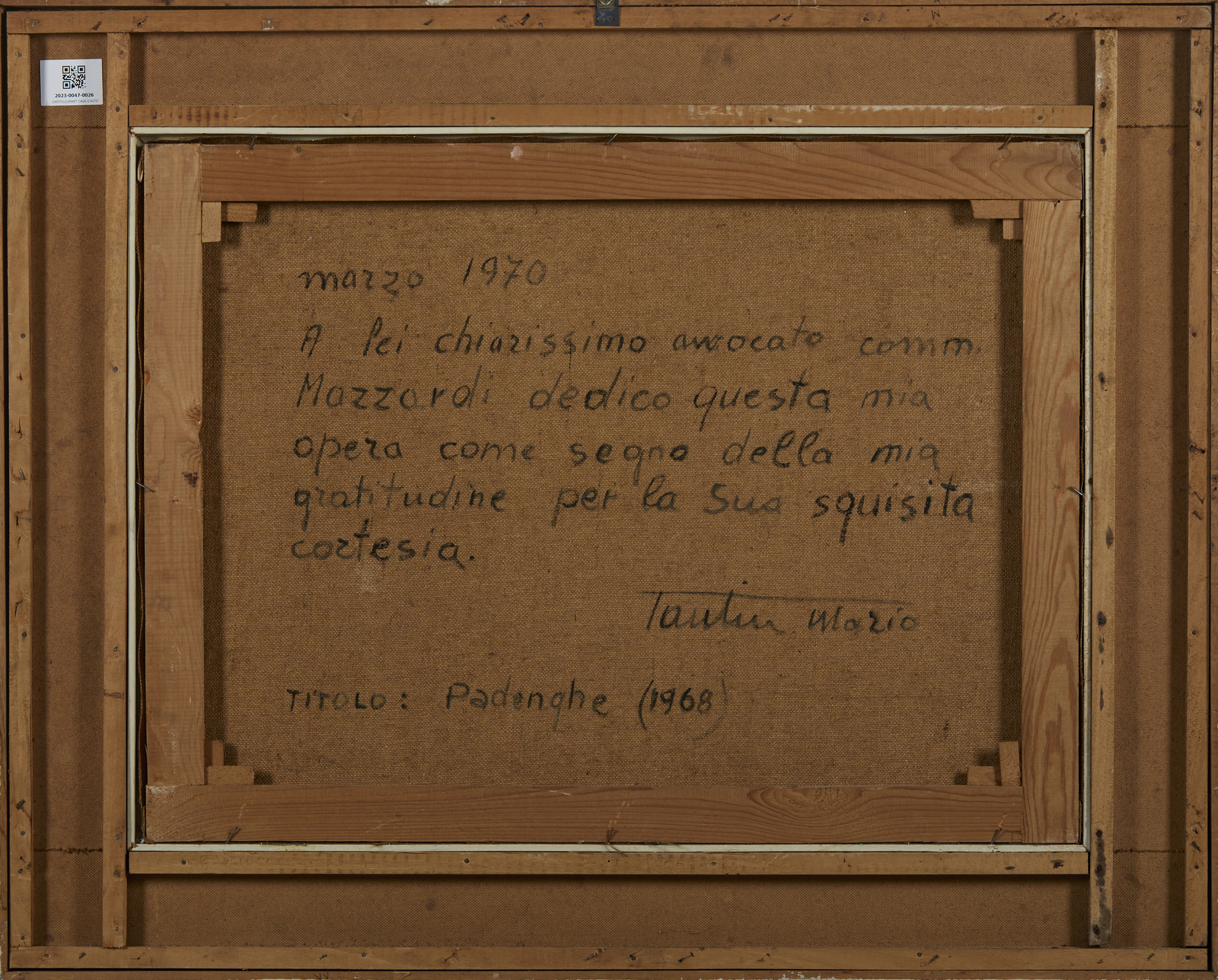 Firma in basso a destra. Al retro titolo, firma, anno e dedica.