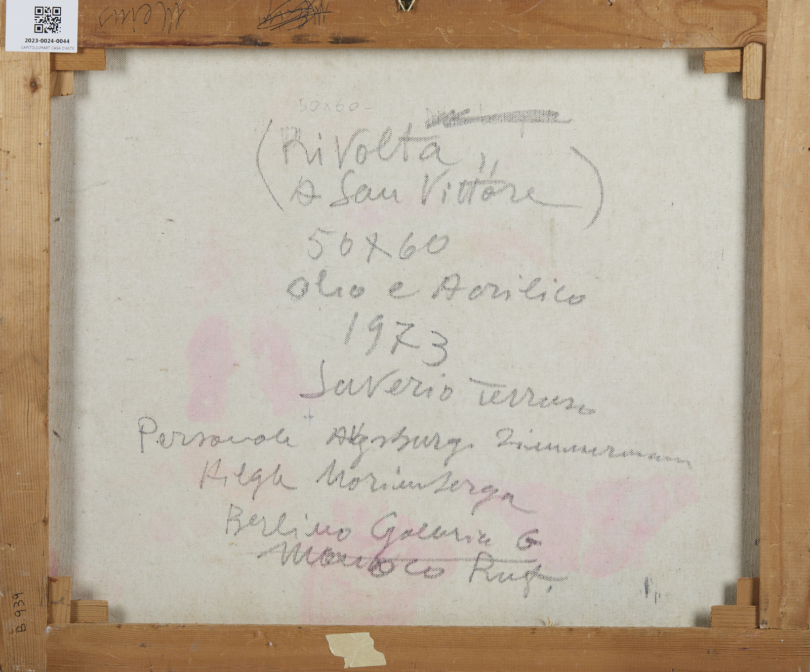 Firma in basso a destra. Al retro titolo, firma e anno. Certificato di provenienza rilasciato da F.B. Arte, Ostellato. Esposizioni: Galleria Elke Zimmermann, Augusta (Germania), 1976.