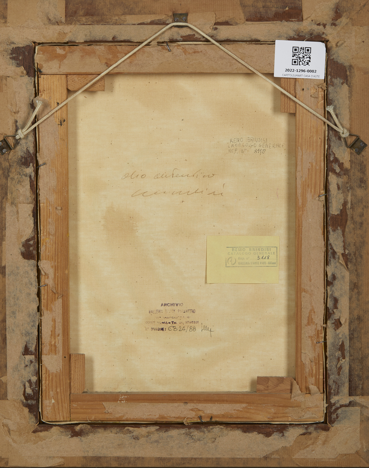 Firma in basso a destra. Al retro firma, cartiglio Galleria Pace, Milano e timbro Archivio Galleria d'arte Parametro, Roma. Opera archiviata presso la Galleria Pace, Milano, come da documentazione fotografica allegata all'opera riportante il relativo numero d'inventario. Provenienza: Galleria Parametro, Roma. Collezione privata, Roma.