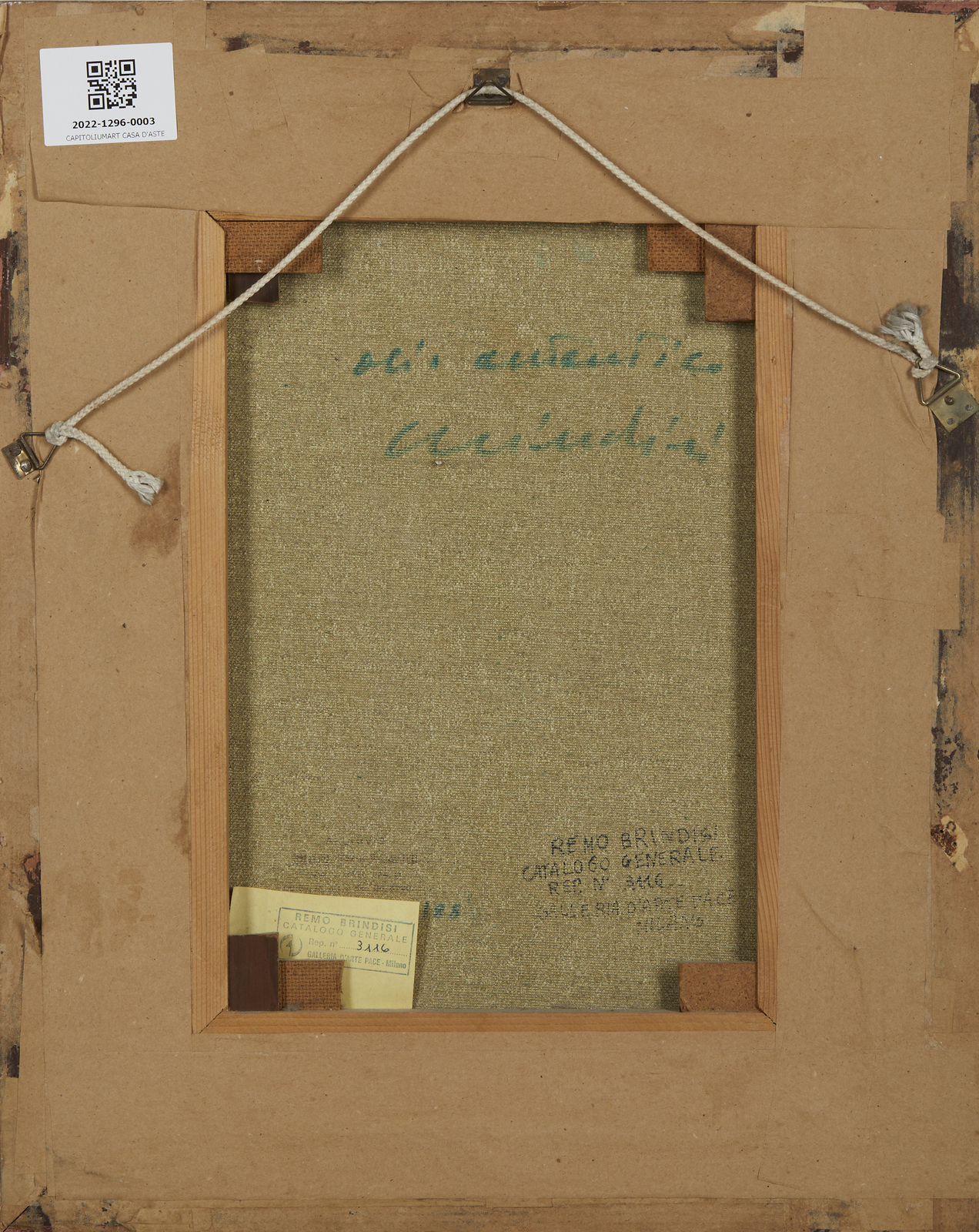 Firma in basso a destra. Al retro firma, timbro Galleria Parametro, Roma e cartiglio Galleria Pace. Opera archiviata presso la Galleria Pace, Milano, come da documentazione fotografica allegata all'opera riportante il relativo numero d'inventario. Provenienza: Galleria Parametro, Roma. Collezione privata, Roma.