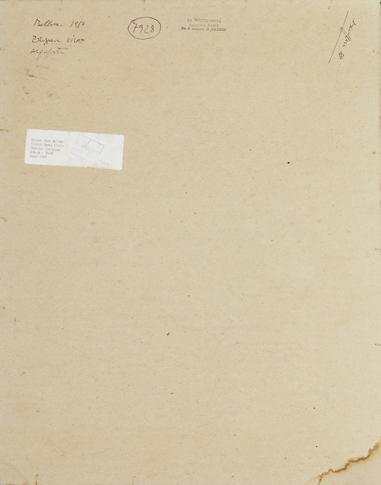 Firma a matita in basso a destra. Al retro timbro Galleria La Bottegaccia, Salerno. Edizioni arteVisat. Difetti.