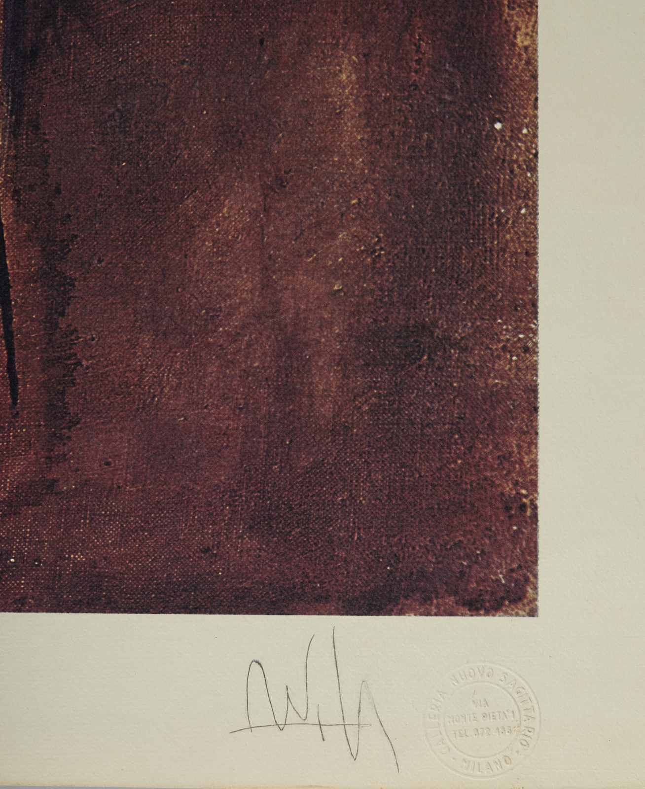 24/50. Tiratura e firma in basso a matita. Timbro a secco Galleria Nuovo Sagittario, Milano, in basso a destra. Al retro timbro Litho d'apres le tableau