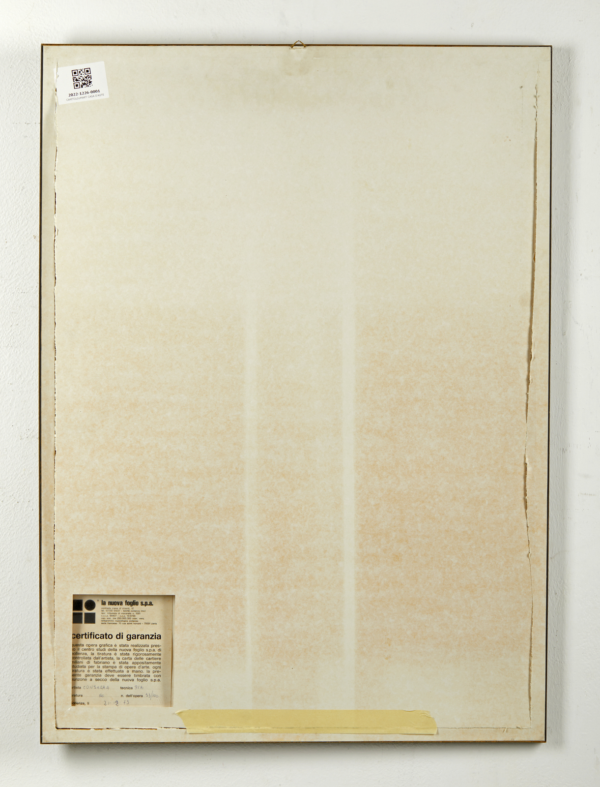 53/100. Tiratura e firma in basso a matita. Timbro a secco Stamperia La Nuova Foglio, Pollenza, in basso a destra. Al retro cartiglio Nuova Foglio, Macerata. XVI Festival dei Due Mondi, Spoleto. Certificato di autenticità Arscritica moderna e contemporanea, Roma. Lievi difetti.