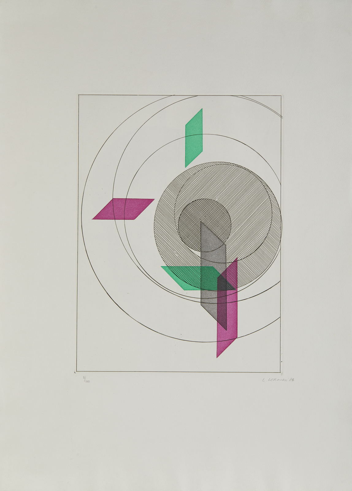 8/100. Tiratura, firma e anno in basso a matita. Dimensione lastra: 38.5x19.5 cm.