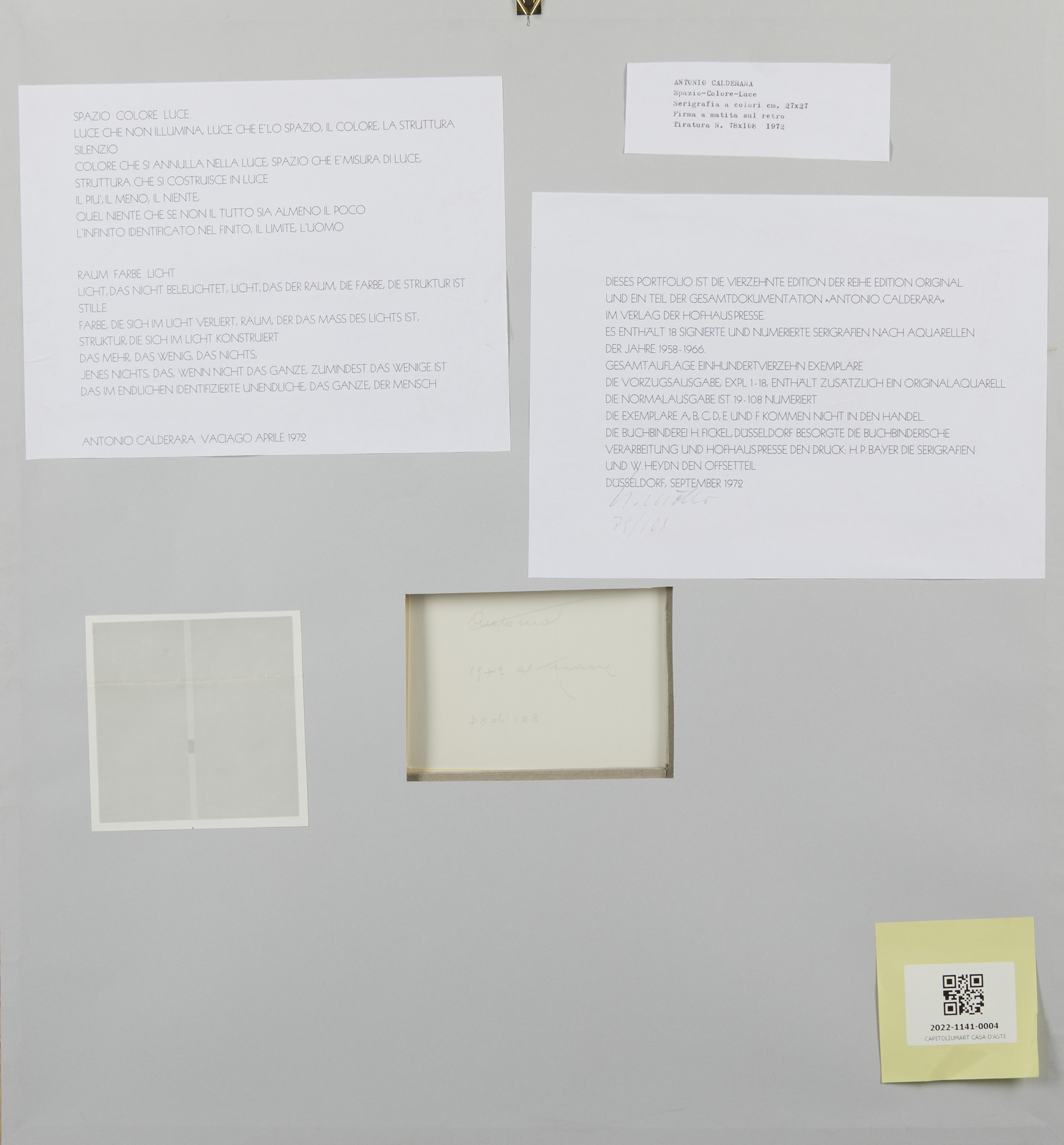 78/108. Al retro tiratura e firma a matita. Edizione totale: 114 copie di cui 108 esemplari numerati da 19/108 a 108/108 + 18 esemplari in edizione speciale con acquerello originale + 6 esemplari numerati dalla lettera A alla F. Queste grafiche fanno parte di un portfolio di 18 serigrafie firmate e numerate, da acquerelli degli anni 1958-1966, quattordicesima edizione della serie originale. Stampatori: H.P. Bayer.