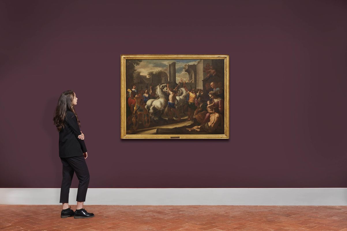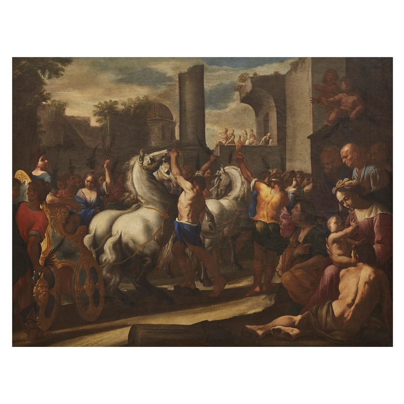 Palesemente ispirato all’antichità classica, il soggetto rimanda in ogni caso all’importante, e a Napoli relativamente inusuale, revival della storia antica che nella seconda metà degli anni Trenta ha la sua massima espressione nel ciclo di storie romane commissionate dal Vicerè spagnolo, il conte di Monterrey, per il palazzo del Buen Retiro a un gruppo di artisti tra Roma e Napoli, tra cui per l’appunto Aniello Falcone e Micco Spadaro.