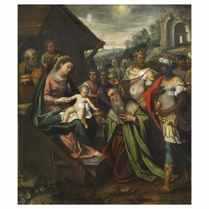 Artista lombardo veneto, sec. XVII ADORAZIONE DEI MAGI olio su tela, cm 111x95 Lombard Venetian Artist, 17th [..]