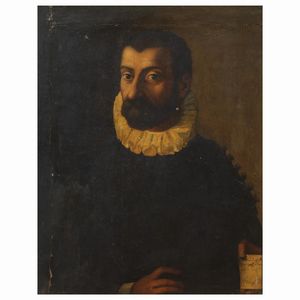 Scuola fiorentina, sec. XVI RITRATTO DI GENTILUOMO CON GORGIERA E LETTERA olio su tavola, cm 68x53,5 Florentine [..]