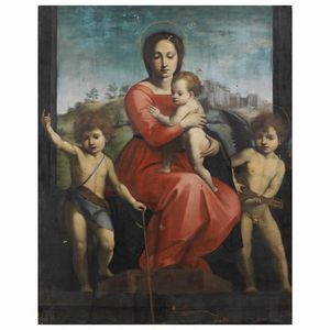 Scuola fiorentina, sec. XVIII MADONNA COL BAMBINO, SAN GIOVANNINO E ANGELO MUSICANTE olio su tela, cm 148,5X115,5 [..]