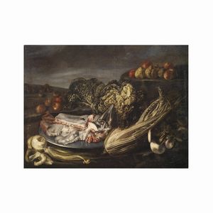 Scuola dell'Italia settentrionale, sec. XVII NATURA MORTA CON FRUTTA, VERDURA E TESTA DI VITELLO olio su tela, [..]