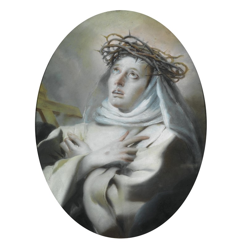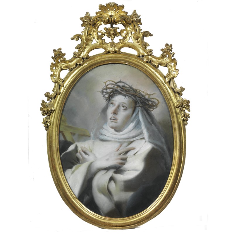 Raro il ricorso di Giambattista e Giandomenico all’uso del pastello, questa tecnica fu piuttosto utilizzata da Lorenzo Tiepolo, in particolare durante il suo soggiorno spagnolo (1762 – 1776). Proprio a Lorenzo fu attribuito questo struggente ritratto della Santa in estasi nella vendita Christie’s di Londra del luglio 2008; eppure, la scioltezza del segno, la trasparenza dello sfumato unite alla matura padronanza del registro coloristico inducono a ritenere che l’opera sia della mano più esperta del fratello maggiore Giandomenico al quale è stata più coerentemente attribuita in occasione della recente mostra dei disegni dei Tiepolo a Roma in Palazzo Caffarelli presso i Musei Capitolini.