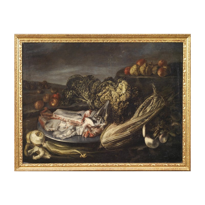 NATURA MORTA CON FRUTTA, VERDURA E TESTA DI VITELLO