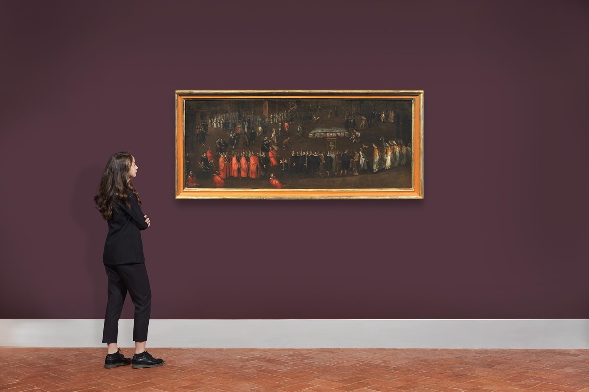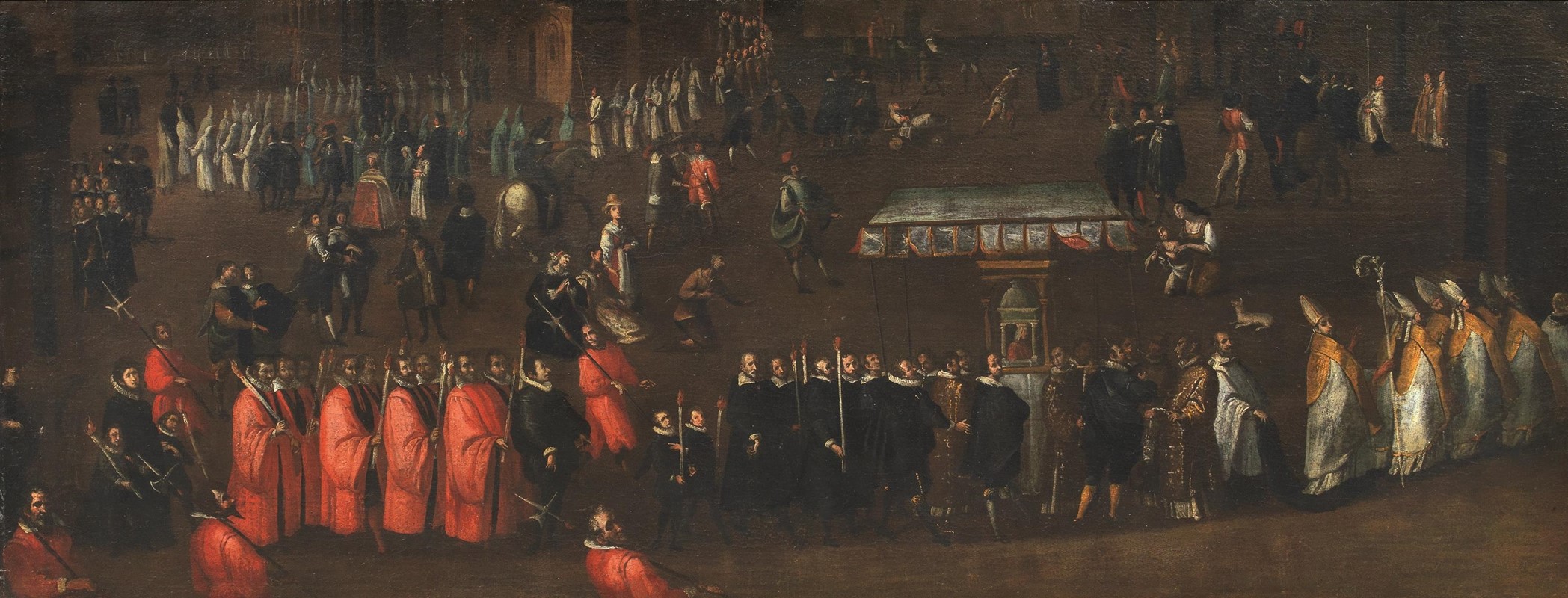 In primo piano importanti autorità civili e religiose accompagnano sotto un baldacchino l’effigie di un re entro un’edicola, a cui alcuni astanti rivolgono gesti di ossequio. Sullo sfondo sfilano battuti di diverse confraternite, data la cappa di colore differente. Purtroppo non essendo identificabile nessuno degli edifici presenti né tantomeno il personaggio a cui è dedicata la processione, non è facile capire a quale evento l’artista abbia voluto farci assistere, evento che a giudicare dai suoi protagonisti si direbbe piuttosto solenne.