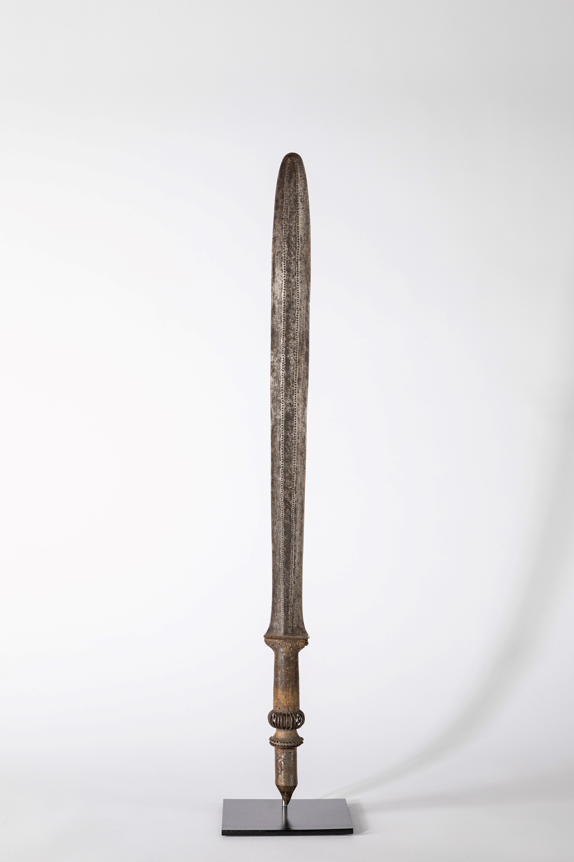Lama in ferro forgiato a doppio tranciante lavorata a bulino sui due lati.