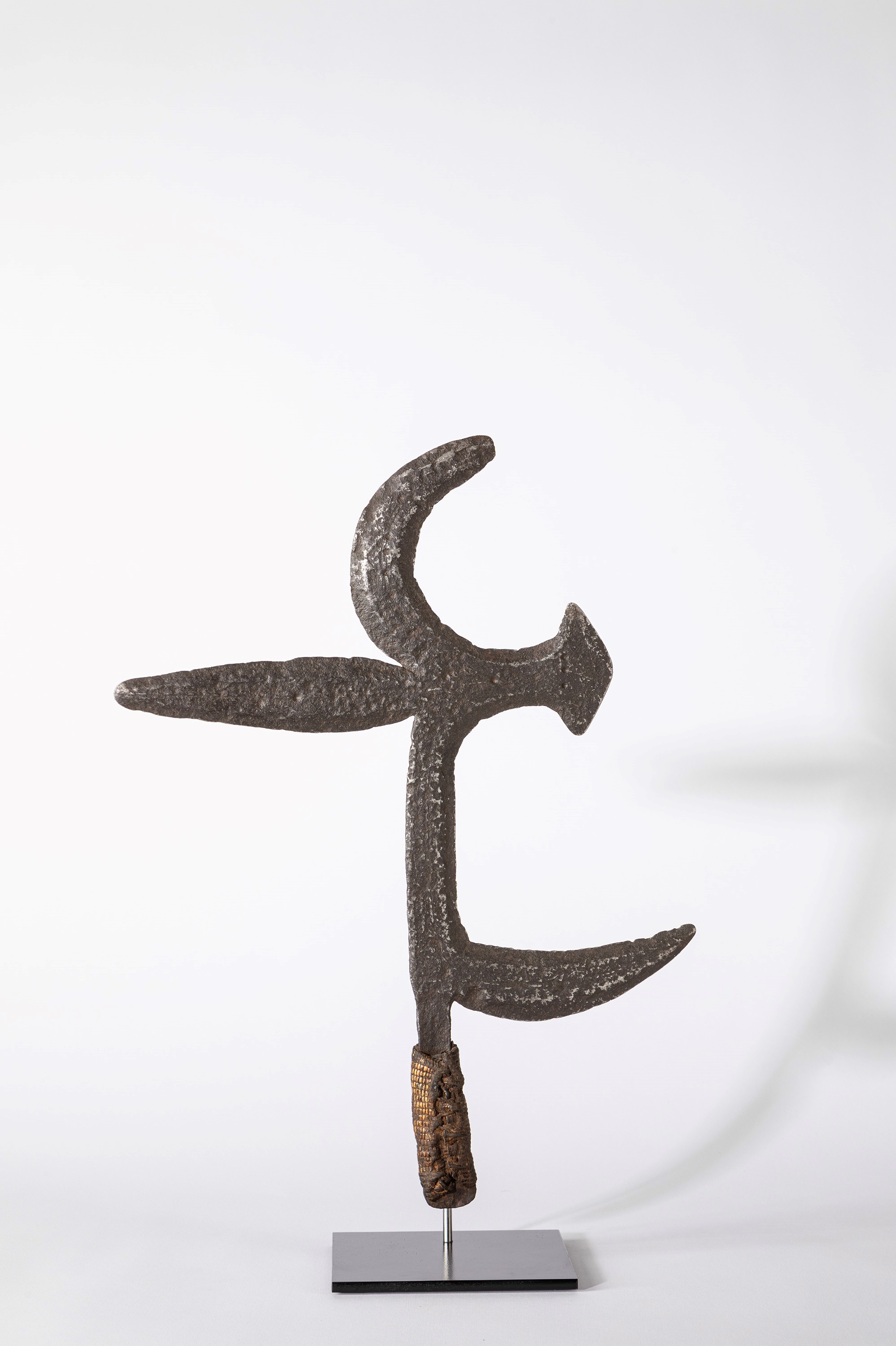 cm 41 x 26 lame in ferro forgiato. Impugnatura ricoperta con pelle di serpente. Segni d’uso, patina d’epoca. Tipo di coltello prodotto ed utilizzato anche da gruppi vicini come Togbo, Banja e Ngbandi. Veniva usato come oggetto di ostentazione durante le cerimonie tribali.