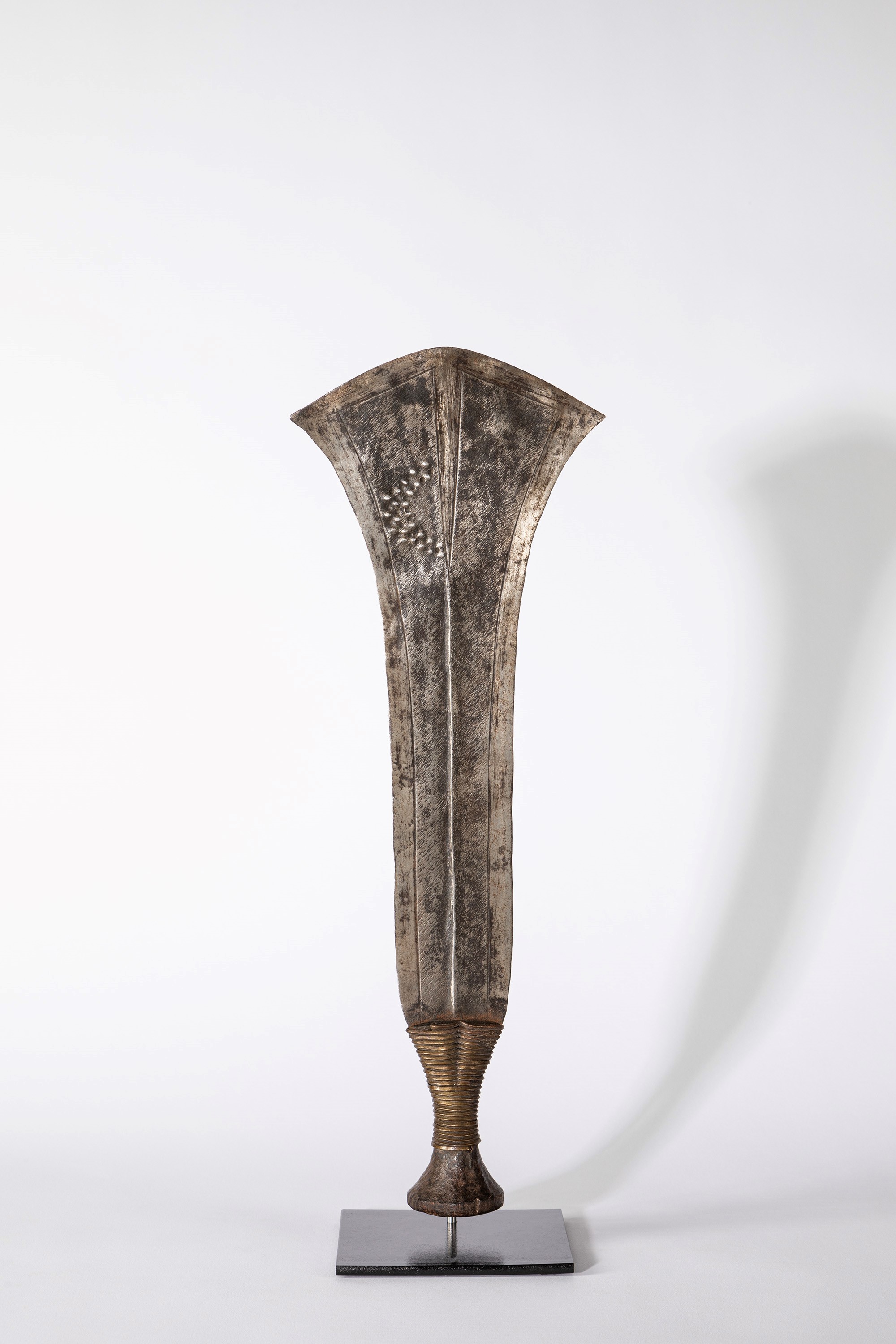Lama in ferro forgiato a doppio tranciante con nervature sagomate sui due lati. Impugnatura in legno ricoperta con piattina di rame. Patina d’epoca Nome d’origine Mongo: Efamba