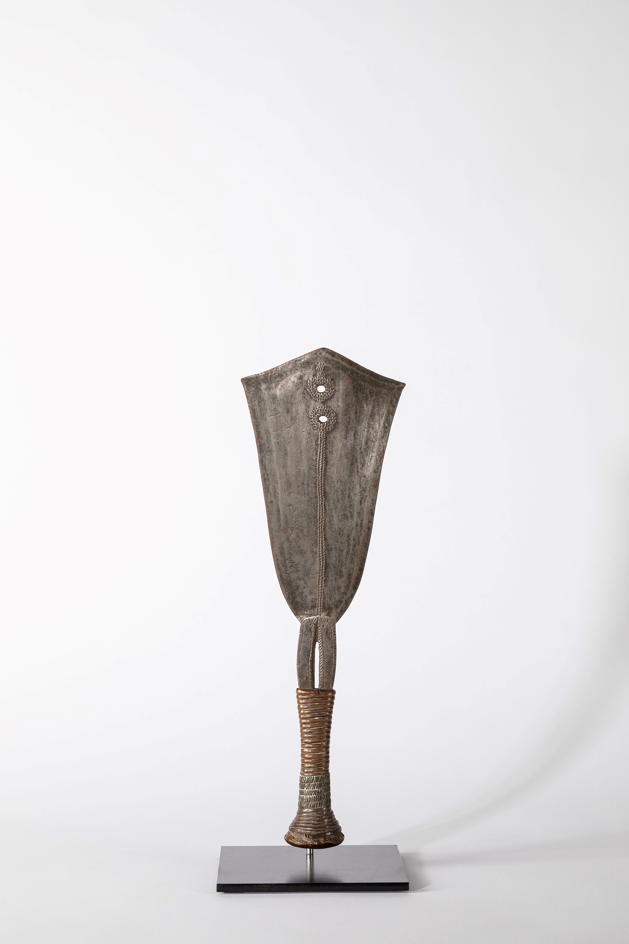cm 33,5 con lama sagomata in ferro forgiato. Impugnatura in legno avvolta con spirali di tondino di rame. La loro somiglianza nella tecnica di costruzione e nei decori ci induce a ritenere che siano stati realizzati da uno stesso fabbro. (rif. lotto 15-16)