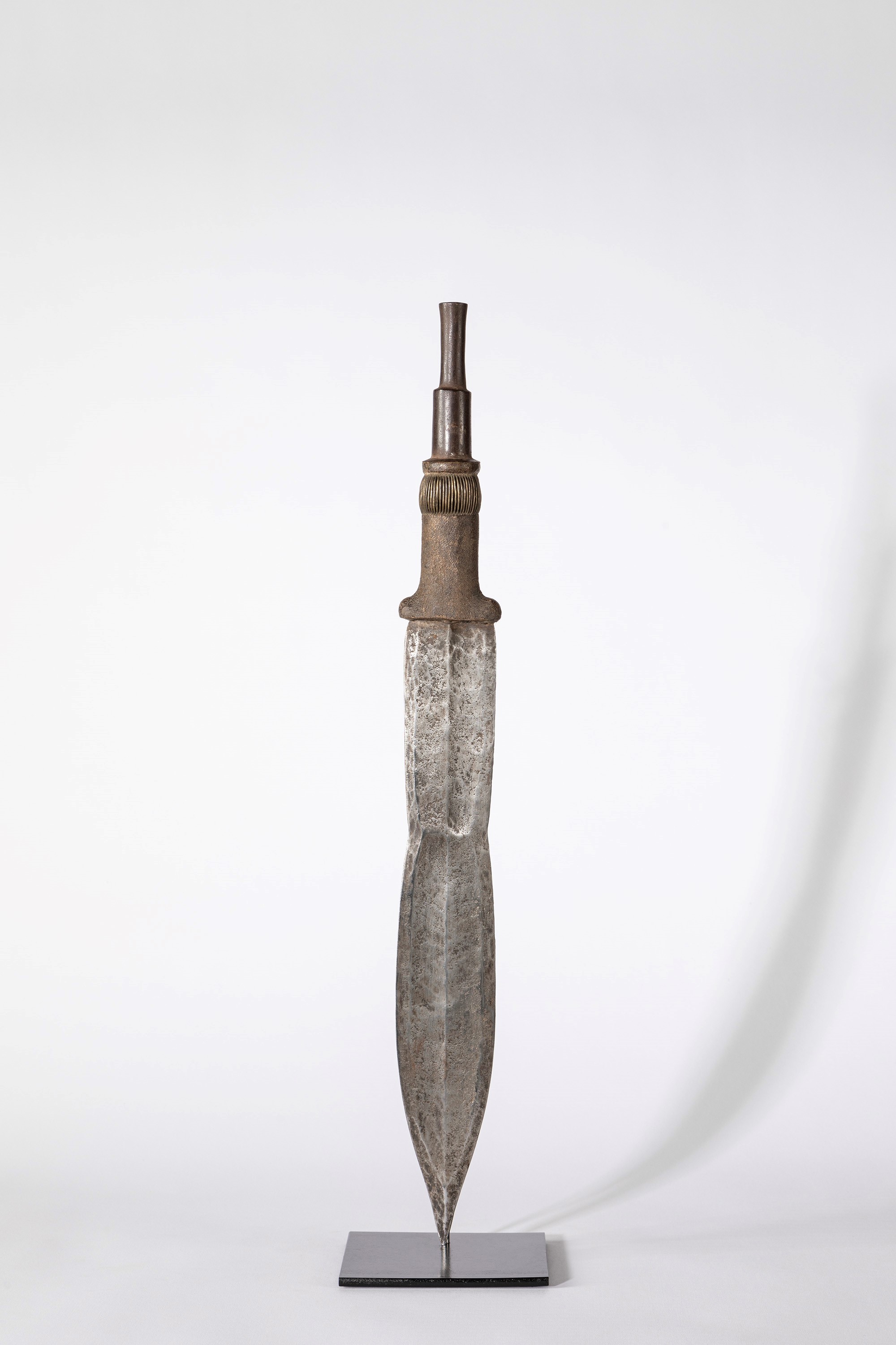 Coltello: cm 55; totale: cm 65 in ferro con fodero rifinito con pelle e borchie. Lama a doppio tranciante in ferro forgiato lavorata a graffio. Impugnatura in legno abbellita in cima con un cilindro di metallo e con una gabbia di archetti di filo di ottone.