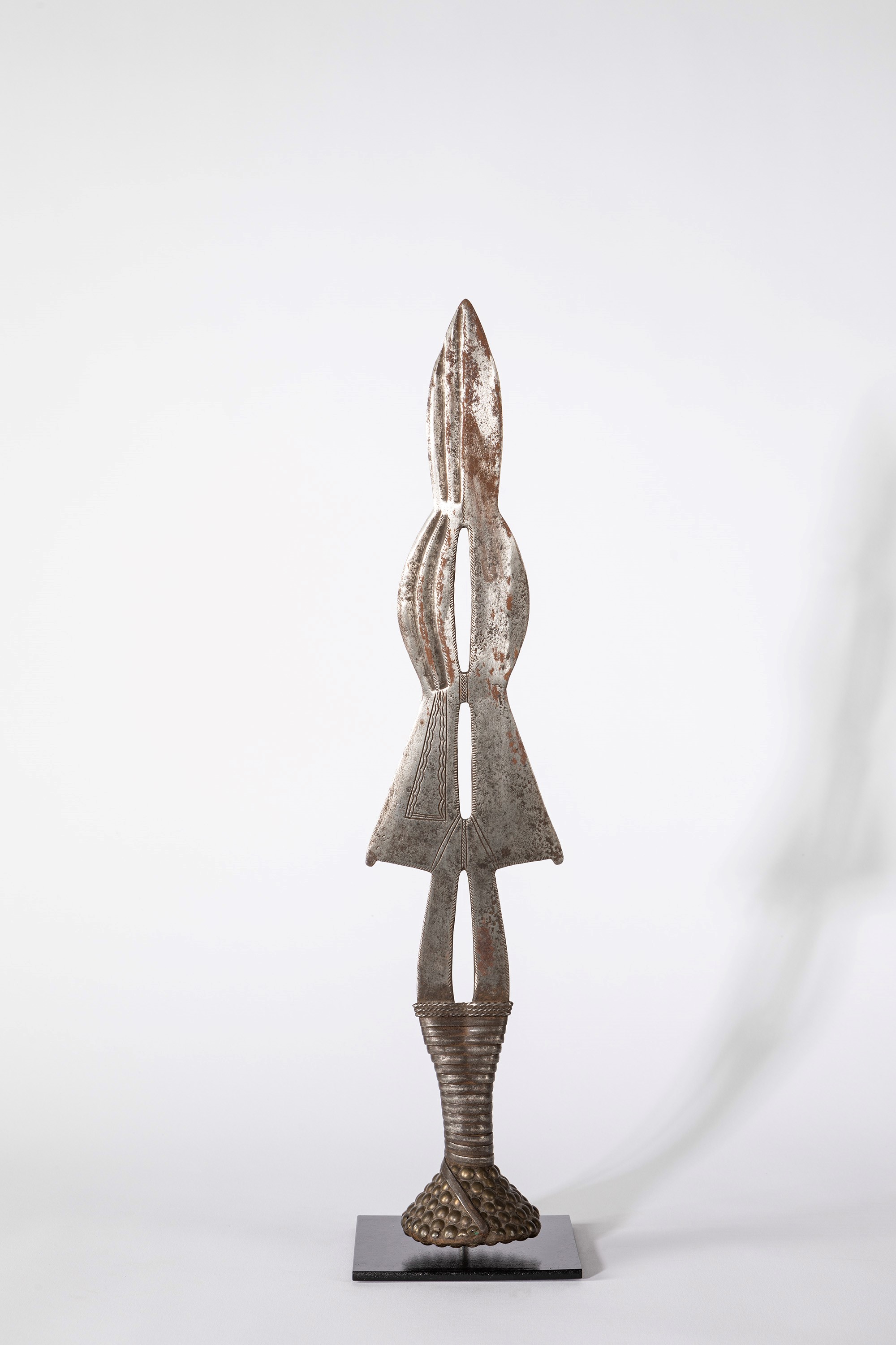 cm 51 Lama in ferro forgiato a doppio tranciante con larghe scanalature lungo l’asse verticale; incisioni caratteristiche. Residui di ossidazione superficiale.Impugnatura in legno avvolta con una spirale di piattina di ferro. La parte terminale è ricoperta con bullette di ottone d’origine europea. Segni d’uso. Oggetto di prestigio Tipo di coltello realizzato in forme analoghe da vari gruppi del Congo settentrionale. Le aperture della lama, oltre ad avere una funzione estetica, servivano per alleggerire il coltello.