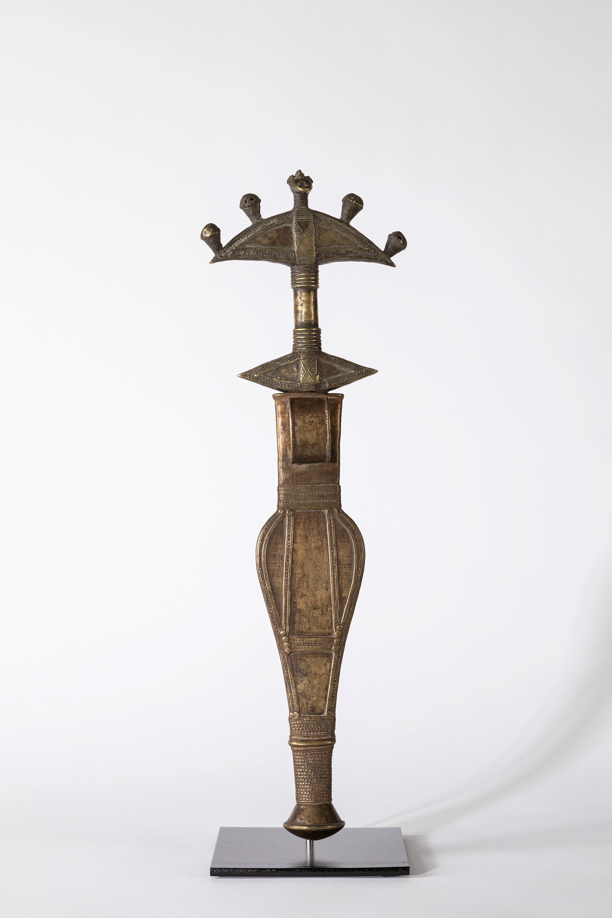 coltello cm 35; totale cm 42 Ottone, ferro e cuoio. Raro coltello ottenuto con il metodo della cera persa, una tecnica adottata anche da gruppi vicini. La lama in ferro forgiato è rifinita con un’impugnatura di ottone caratteristica con cinque testine. Il fodero di ottone è impreziosito con raffinati motivi tipici della produzione di questi gruppi. Oggetto di prestigio