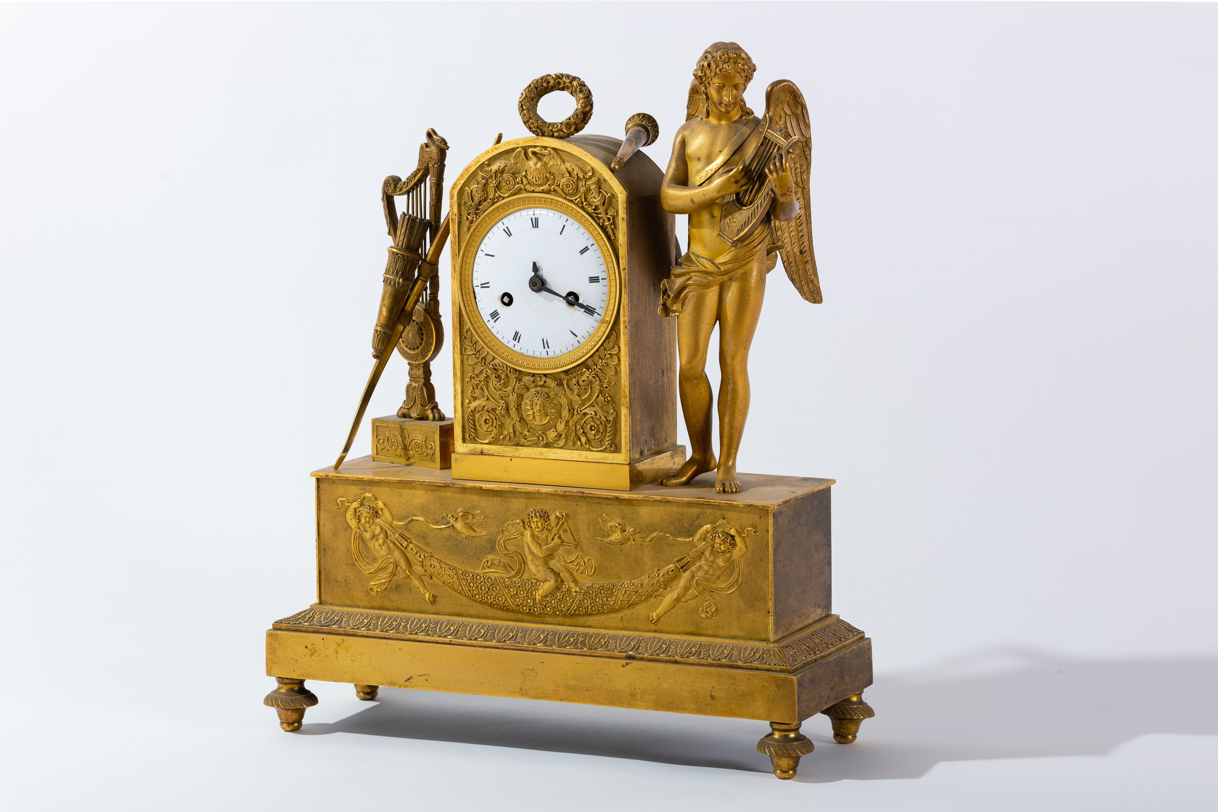 Pendola Impero in bronzo dorato con Cupido che suona la cetra, inizi secolo XIX